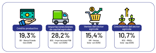Un ejemplo claro se refleja en el sector agrícola, que atraviesa un proceso de expansión y modernización. El incremento de inversiones en maquinaria especializada, construcción de nuevas plantas y adopción de tecnologías productivas se traduce en mayores niveles de eficiencia y en un impulso directo a las exportaciones ecuatorianas.
