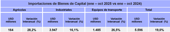 El crecimiento en la adquisición de bienes de capital se observa principalmente en los segmentos agrícola, industrial y de equipos de transporte, actividades esenciales para el desarrollo económico y la generación de empleo. Estos activos duraderos —como maquinaria, sistemas de procesamiento y equipos especializados— son fundamentales para producir bienes y servicios, y constituyen una inversión clave para elevar la productividad y la competitividad del país en el mediano y largo plazo.