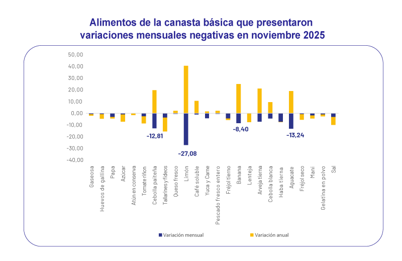 En noviembre de 2025, el 64,9% de los alimentos que conforman la canasta básica presentaron variaciones negativas mensuales, entre los que se destacan los huevos, la papa y el azúcar, productos de consumo cotidiano en los hogares ecuatorianos.