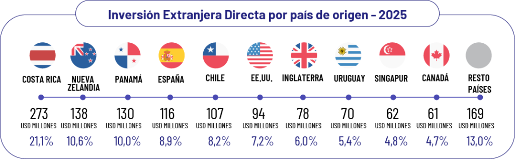 A nivel internacional, países como Costa Rica, Nueva Zelanda y Panamá lideran el origen de estos capitales, confirmando el renovado interés global por el país.